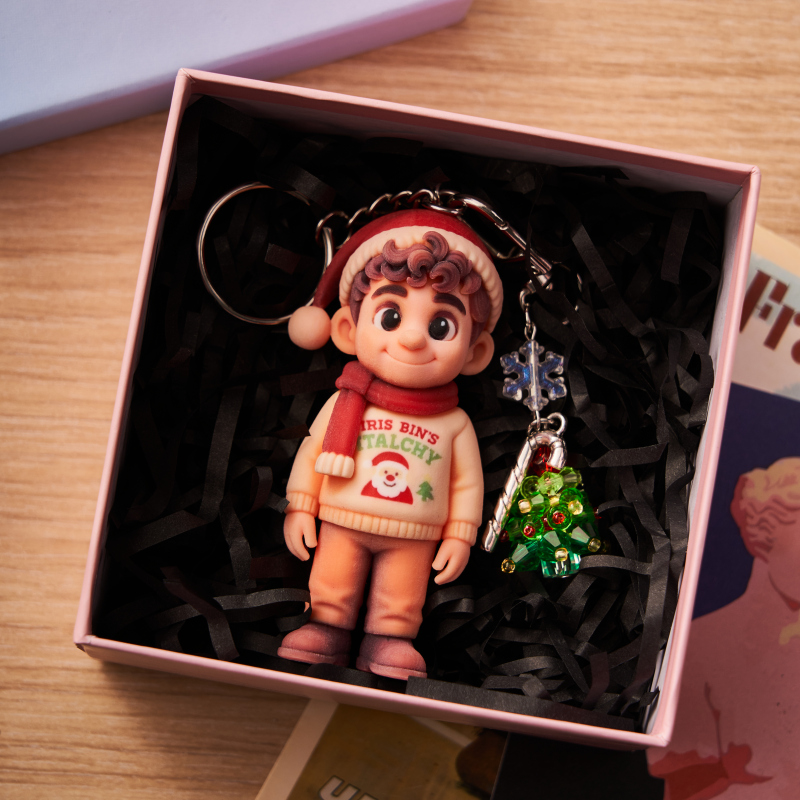Porte-Clés 3D Personnalisé À Partir D’une Photo Avec Pendentif Sapin De Noël En Cristal Et Mini-Figurine Personnalisée. Un Porte-Clés Unique Et Un Cadeau Créatif Avec Accessoire Sapin.